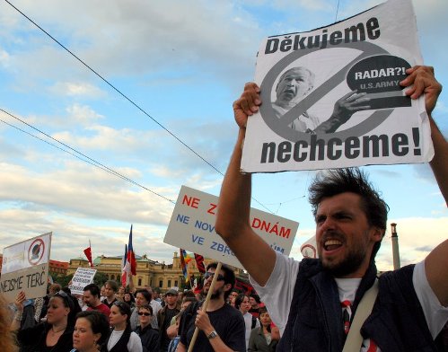 資料圖片:數(shù)千捷克民眾今年8月8日在布拉格舉行示威游行,抗議政府簽約同意美國在捷克建立反導(dǎo)雷達基地。這位示威者舉著的標語寫道:“謝謝,我們不要美國雷達!” (攝影:黃頻/中歐社)