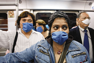 墨西哥城的地鐵車廂,人人都戴口罩防豬流感。