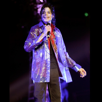 TMZ網(wǎng)站刊登的四張照片中,杰克遜看起來身形消瘦,但舞姿豐采不減。其中一張照片,杰克遜身穿紫色長袖襯衫配黑色長褲,右手拿著麥克風,笑得頗開心。