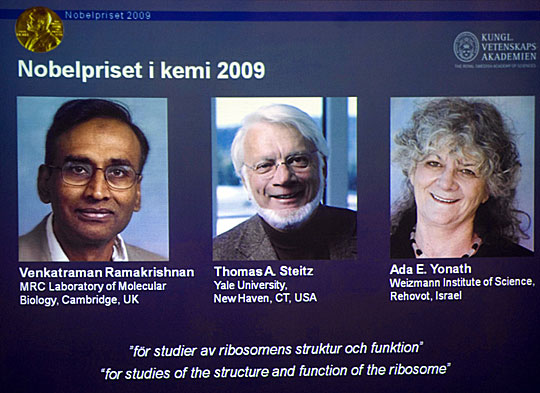拉馬克里希南1952年出生于印度,目前持美國(guó)國(guó)籍,任職于英國(guó)劍橋MRC分子生物學(xué)實(shí)驗(yàn)室;施泰茨1940年出生于美國(guó)威斯康星州,任職于美國(guó)耶魯大學(xué)和霍華休斯醫(yī)學(xué)研究所;約納特1939年出生于耶路撒冷,任職于以色列魏茨曼科學(xué)研究所。3人將平分諾貝爾化學(xué)獎(jiǎng)獎(jiǎng)金1000萬瑞典克朗。