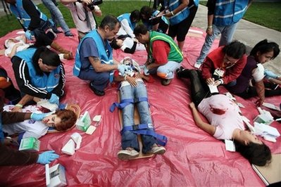 醫(yī)務(wù)人員正在“搶救”由民眾扮演的地震傷員。