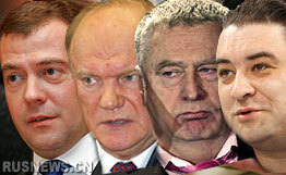 共有四位候選人競爭繼葉利欽和普京之后的俄羅斯總統(tǒng)職位。他們是幾度競選過總統(tǒng)的俄羅斯共產(chǎn)黨主席根納季·久加諾夫、自民黨主席符拉基米爾·日里諾夫斯基,還有初次競選總統(tǒng)的俄羅斯民主黨主席波格丹諾夫和第一副總理梅德韋杰夫。