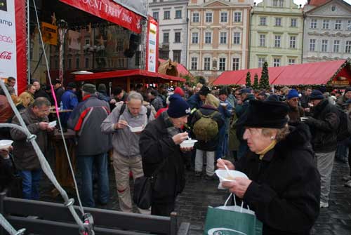 布拉格市政廳一如既往12月24日中午在市中心老城廣場向無家可歸的人免費發(fā)放魚湯。