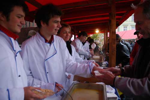 6年來布拉格市長貝姆第一次沒有親自操勺打湯,據(jù)說這位跑過馬拉松,登過珠峰的運動愛好者人在南極,他的太太拉德米拉.貝娃帶著兩個兒子為市民服務(wù),向每一位領(lǐng)湯的人轉(zhuǎn)達她丈夫的節(jié)日問候。