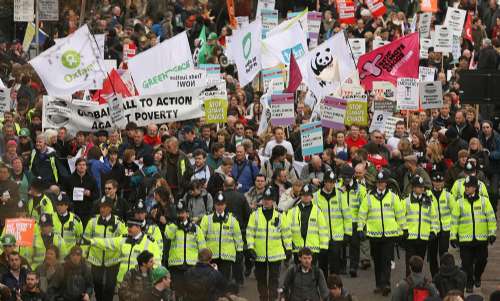 示威者行經(jīng)國會大樓,吹響哨子,大喊“我們憎恨銀行”,標(biāo)語五花八門,有“人民為先、利潤居后”、“離開伊拉克和阿富汗”等,部分語句則較為激進(jìn),如“問吊銀行家”、“沖擊銀行”。當(dāng)他們行至唐寧街的首相府時,紛紛報以噓聲。