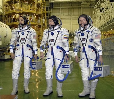 理查德-加里奧特(左)與兩位專(zhuān)業(yè)宇航員同伴身著太空服。