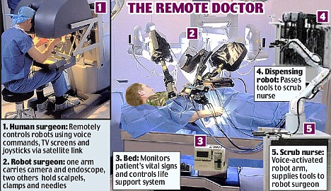 為了挽救更多士兵的生命,五角大樓已經(jīng)投資875萬英鎊,與美國加州斯坦福研究院下屬的高科技公司簽訂制造多功能機器人的合約,包括名為“療傷機”的機器人醫(yī)生。這種機器人有三條手臂,一條用來控制內(nèi)診鏡,讓人類醫(yī)生可以看到傷者身體內(nèi)部情況,另外兩條手臂則拿著外科手術(shù)工具。此外,還有一種“擦洗護士”機器人,負責(zé)為機器人醫(yī)生傳遞各種工具。這些機器人也能與病人交談,安慰他們,以及問他們一些問題。