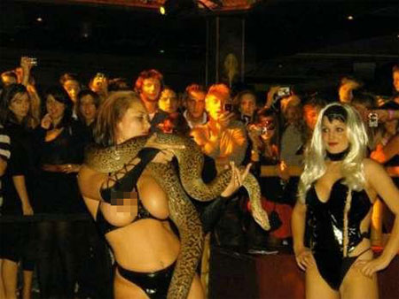 兩名身上涂滿油的表演者裸著上身摔跤,其他人的打扮也很性感,她們穿著用天然乳膠制成的服裝。晚會的重頭戲是裸著上半身的女郎表演舞巨蟒,一只長四米的巨蟒爬過女郎赤裸的胸部和肩部。
