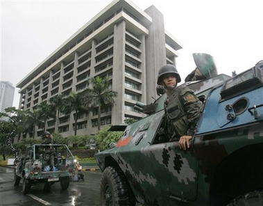 據(jù)報(bào)道,這些菲律賓叛軍29日占領(lǐng)馬尼拉半島酒店,要求總統(tǒng)阿羅約辭職。政府給予那些士兵的投降限期已屆滿。政府此前要求這些士兵限期無條件投降。