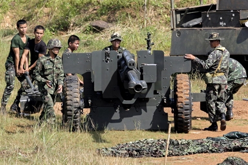 泰國(guó)軍人正在泰柬邊境架設(shè)高射炮。