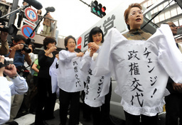 同時,日本在野黨民主黨派出了三位高官夫人——民主黨最高顧問、日本前首相羽田孜的夫人綏子、代表代行菅直人的夫人伸子、干事長鳩山由紀夫的夫人幸!叭蛉塑妶F”身穿廚師樣式的服裝,上書“改變!政權替換”,來到東京巢鴨的購物街,和正在購物的家庭婦女一一握手。其間,一名60歲的老婆婆一臉郁悶,說“我已經在很努力削減家庭開支了,可是國家還是在浪費!比环蛉笋R上建議說,“下次讓民主黨執(zhí)政看看吧!”