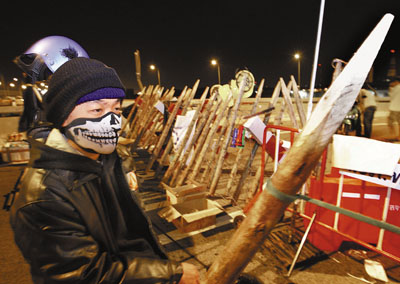 民盟示威者全副武裝,在機場外要道把關(guān)。