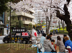 日本右翼宣傳車前往東京的在日朝鮮人總聯(lián)合會(朝鮮總聯(lián))前進(jìn)行“騷擾”,右邊為周末在公園賞櫻的人們,遠(yuǎn)處為正在執(zhí)行任務(wù)的警察。(共同社)