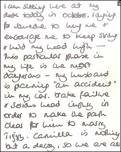 戴安娜在信中寫到,“我現(xiàn)在坐在這里,希望有人能來抱抱我,鼓勵我保持堅強,昂起我的頭顱。我生命現(xiàn)在處在一個非常危險的時期,我的丈夫想要制造一起‘車禍’謀殺我,比如剎車失靈然而引起頭部重傷等等。只有這樣他才能為自己與堤姬(查爾斯與戴妃離婚后專門負(fù)責(zé)照顧哈里和威廉的保姆)成婚掃清障礙。卡米拉不過是個誘餌,而我們兩人都是被他利用了。”