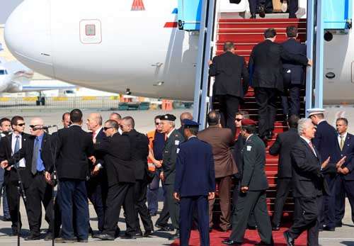 剛剛結(jié)束對以色列訪問的薩科齊夫婦以及隨訪的法國官員正同以色列總統(tǒng)佩雷斯和總理奧爾默特等人握手告別。法國安全人員突然涌過來讓薩科齊夫婦迅速上飛機,而以色列安全人員也迅速轉(zhuǎn)移了佩雷斯和奧爾默特。