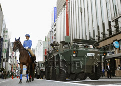 8月31日東京舉行地震救援演習(xí),警視廳騎警隊和自衛(wèi)隊的裝甲車參加演習(xí)。(共同社圖片)