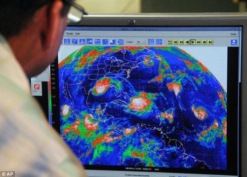 美國國家颶風(fēng)中心氣象專家在查看一幅颶風(fēng)衛(wèi)星照片,顯示出古斯塔夫和漢娜颶風(fēng)。