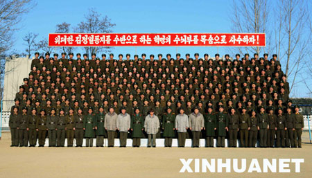 資料圖片:在這張朝鮮中央通訊社12月19日公布的照片中,朝鮮最高領(lǐng)導(dǎo)人金正日與人民軍955部隊指戰(zhàn)員合影。據(jù)朝鮮中央通訊社19日報道,金正日于近日視察了朝鮮人民軍955部隊司令部。新華社/朝中社