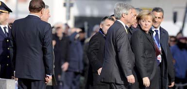 貝盧斯科尼撇開歡迎委員會的工作人員,藏在一個街燈柱后面。當(dāng)?shù)聡偫砟藸栕呦聦\嚕M入他們會面的地區(qū)委員會總部時,他突然從街燈柱后面跳出來,嘴里還喊著“咕咕”。據(jù)說默克爾看起來很開心,與貝盧斯科尼擁抱,并且親切地稱其“西爾維奧” 。