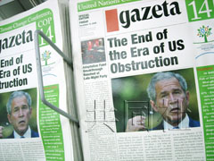 中新網(wǎng)12月13日電 據(jù)日本共同社報(bào)道,隨著《氣候變動(dòng)框架公約》締約國(guó)第14次會(huì)議在波茲南閉幕,波蘭著名報(bào)紙《選舉報(bào)》(英文版)12日刊行一份“假號(hào)外”,諷刺美國(guó)布什政府始終拒絕批準(zhǔn)《京都議定書》。