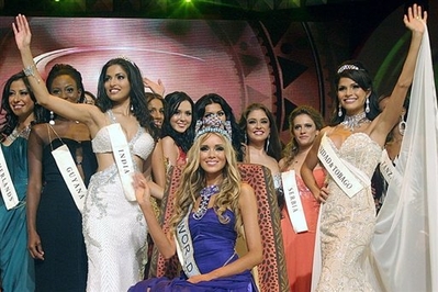 俄羅斯小姐Ksenya Sukhinova(中),印度小姐Parvathay Omanakuttan(前左)及特立尼達(dá)和多巴哥小姐Gabriel Walcott。