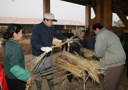 劉曉明大使一行首先來(lái)到打谷場(chǎng),同當(dāng)?shù)剞r(nóng)場(chǎng)員們一道把一個(gè)個(gè)稻捆送進(jìn)大型脫谷機(jī),然后把脫谷后剩下的秸稈扎捆,送進(jìn)倉(cāng)庫(kù)。使館同志和農(nóng)場(chǎng)員有的碼垛,有的搬運(yùn),有的擰麻繩,大家為了共同的豐收忘我地勞動(dòng)。機(jī)器的轟鳴猶如歡慶的鑼鼓聲、粒粒稻谷送來(lái)的是豐收的喜悅。