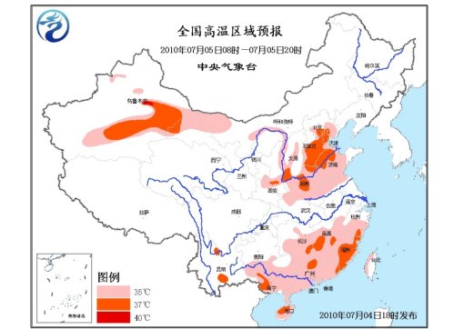 中央氣象臺(tái)于4日18時(shí)繼續(xù)發(fā)布高溫黃色預(yù)警:預(yù)計(jì),5日白天甘肅西北部、內(nèi)蒙古西部的部分地區(qū)、陜西東北部和關(guān)中地區(qū)、山西中南部、河北中南部、北京中南部、天津、河南、山東中西部、湖北西北部、安徽北部、江蘇北部、江南中南部、華南大部、貴州南部等地有35~37℃、局地38~40℃的高溫天氣。