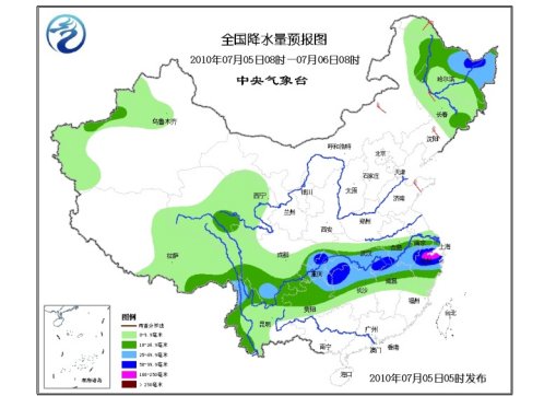 中新網(wǎng)7月5日電 中央氣象臺今晨6時(shí)發(fā)布短期天氣預(yù)報(bào),未來三天,青藏高原中東部、西北地區(qū)中東部、西南地區(qū)、江漢、江淮、江南中北部等地有降水,其中,重慶大部、湖北南部、湖南北部、安徽南部、江西北部、浙江大部、福建北部等地有大到暴雨、局地大暴雨,西藏東南部、云南西北部等地有大雨;新疆北部、內(nèi)蒙古東北部、東北大部多陣雨或雷雨,其中,黑龍江東部、吉林東部等地的部分地區(qū)有大雨、局地暴雨。上述部分地區(qū)并伴有短時(shí)雷雨大風(fēng)或冰雹等強(qiáng)對流天氣。