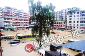 前晚9時許,酉陽縣城開始下起暴雨。昨晨,酉城河水也漫過河床,涌向縣城主街的低洼角落。至上午10時許,縣城東風(fēng)壩、城北車站、小商品一條街、桃花源中路等街道門面進(jìn)水,水深1.5米左右,酉陽報社被淹,停放在街邊、車站內(nèi)的許多車輛被水淹沒。