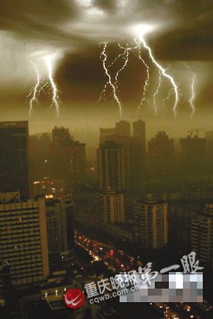 昨上午10時左右,大片的黑色云朵從北向南逼近并覆蓋主城上空,原本已放亮的天空,慢慢地變黑,短短10多分鐘,整個主城區(qū)已經(jīng)宛如黑夜,馬路上的車輛紛紛打開車燈,緩慢行駛!疤旌凇睕]多久,閃電劃破“夜空”,驚雷緊隨而至,并未經(jīng)過鋪墊,大雨如注鋪天蓋地砸向地面,突如其來的暴雨,致使主城很多地方的道路產(chǎn)生積水。