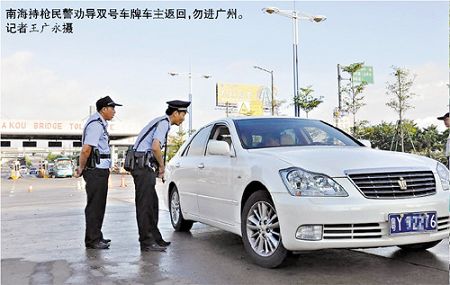 記者昨日在五丫口收費(fèi)站看到,7時(shí)一到,幾名交警和協(xié)管員便行動(dòng)起來,站在路旁對雙號(hào)車進(jìn)行“攔截”。僅僅在一個(gè)小時(shí)內(nèi),南海桂城交警中隊(duì)的梁隊(duì)長和隊(duì)友便勸返了近百名雙號(hào)車車主。梁隊(duì)長稱,他們在此只是配合廣州“限行”,不會(huì)對車主罰款,告誡車主廣州實(shí)施“限行”,不要進(jìn)入廣州,可在過橋處的掉頭路口返回佛山。