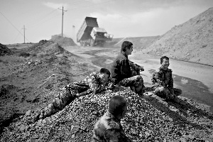 老金在這里住了10多年了。四五年前,家門口的山上還到處覆蓋著青草,F(xiàn)在,只有黑色的煤矸石和被翻出的紅褐色過火石(煤田內(nèi)部被煤火燒過的石頭),形成連綿不斷的渣堆。