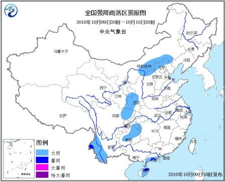 10月9日20時到10日20時,廣東西南部、海南中東部、云南西部、四川東北部、重慶東南部、貴州東北部、甘肅東部、陜西西南部、山西北部、河北西北部、內蒙古中部偏南地區(qū)等地有大雨,其中,云南西部、海南東部、廣東西南部等地的部分地區(qū)有暴雨。上述地區(qū)局部伴有短時雷雨大風等強對流天氣。
