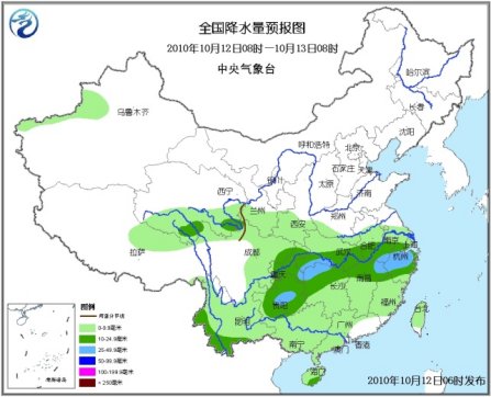 中新網10月12日電 據中央氣象臺預報,未來三天,新疆西部山區(qū)、西藏東部、青海東部和南部、內蒙古東北部、黑龍江西北部、甘肅南部、川西高原西北部等地有小到中雨(雪)或雨夾雪,西藏東北部、青海東南部局地有大雪;陜西南部、黃淮南部、江淮、江漢、江南、華南、西南等地有小到中雨或陣雨,其中,四川南部、重慶中北部、貴州中部、云南北部、湖南北部、湖北南部、江西北部、安徽南部、浙江中部等地有大雨,上述地區(qū)局部并伴有短時雷雨大風等強對流天氣。