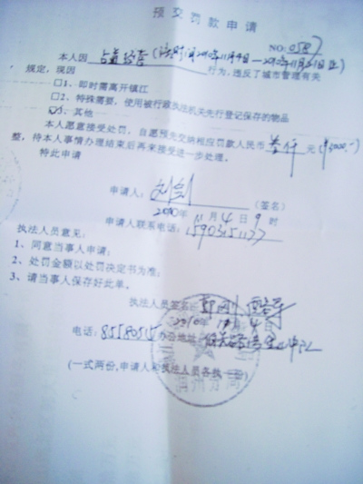 記者現(xiàn)場調(diào)查采訪時,發(fā)現(xiàn)大多攤主的手中,除了攤位費(fèi)收款收據(jù)外,還有一張由“鎮(zhèn)江市城市管理行政執(zhí)法局潤州分局”印制的“預(yù)交罰款申請”單復(fù)印件,申請人是組織者劉某。內(nèi)容是“本人因占道經(jīng)營行為,違反了城市管理有關(guān)規(guī)定,本人愿意接受處罰,自愿預(yù)先繳納相應(yīng)罰款人民幣叁仟元整,待本人事情辦理結(jié)束后再來接受進(jìn)一步處理”。