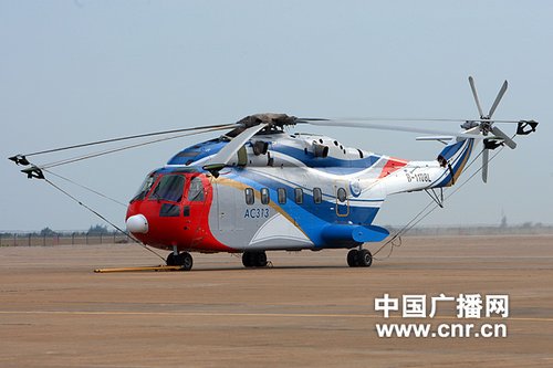 中航生產(chǎn)的我國(guó)最大的直升機(jī)AC313將首次在航展亮相并參加飛行表演(中廣網(wǎng)記者邱翔 攝)