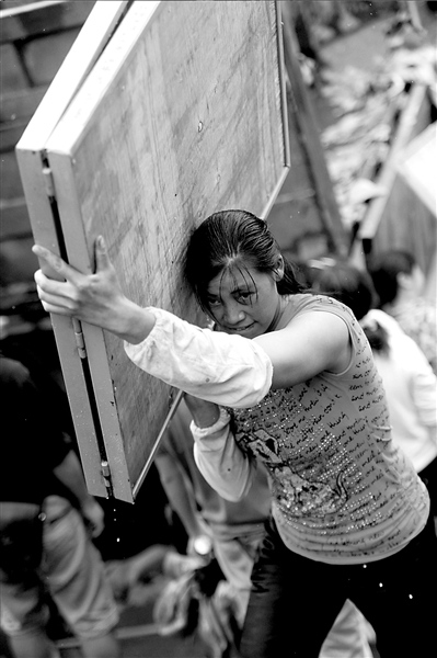 羅炳輝將軍廣場是彝良最大的災(zāi)民安置點(diǎn)之一,2000名受災(zāi)群眾集中安置在百余個帳篷內(nèi)。50多歲的毛振強(qiáng)和老伴帶著兩個孫子一起住在帳篷里。前天夜間,他和安置點(diǎn)的其他人一樣,被大風(fēng)和暴雨擾得睡不著覺。昨天凌晨1點(diǎn)左右,廣場上開始積水,很快水就漫過薄薄的紙板,被褥衣物都洇濕了!拔覀冓s緊把東西收拾起來,就這么站了一夜沒能睡覺。”由于帳篷內(nèi)物品進(jìn)水,昨天白天,安置點(diǎn)內(nèi)的很多災(zāi)民連坐的地方都沒有,蹲在地上吃飯,也沒法睡覺。