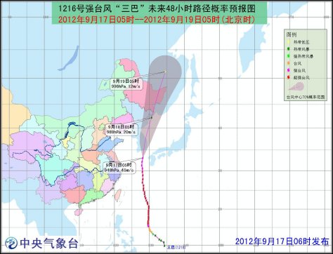 今年第16號(hào)超強(qiáng)臺(tái)風(fēng)“三巴”于昨日(16日)20時(shí)減弱為強(qiáng)臺(tái)風(fēng),今晨5時(shí),中心附近最大風(fēng)力有14級(jí)(45米/秒),中心最低氣壓為948百帕。預(yù)計(jì)“三巴”將于17日中午前后登陸,登陸地點(diǎn)鎖定在韓國南部一帶沿海,強(qiáng)度逐漸減弱。受“三巴”影響,東北地區(qū)中東部將有中到大雨,部分地區(qū)有暴雨。