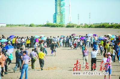 、俑瓯诟沟,藍天下,發(fā)射塔內(nèi)的神舟十號飛船和長征2F遙十火箭組合體揭開其神秘的面紗,航天城的居民、各路記者以及嘉賓游客云集于此,目睹這載入歷史的一刻。