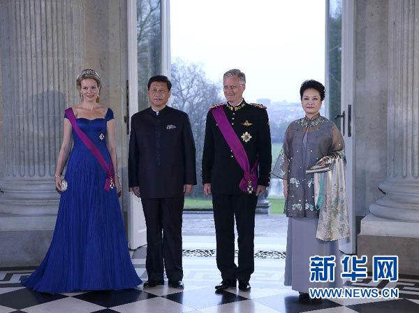 3月31日晚,比利時(shí)國(guó)王菲利普在布魯塞爾拉肯宮舉行隆重國(guó)宴歡迎國(guó)家主席習(xí)近平到訪。習(xí)近平和夫人彭麗媛抵達(dá)時(shí),受到菲利普國(guó)王和瑪?shù)贍柕峦鹾鬅崆橛印?新華社記者 龐興雷 攝