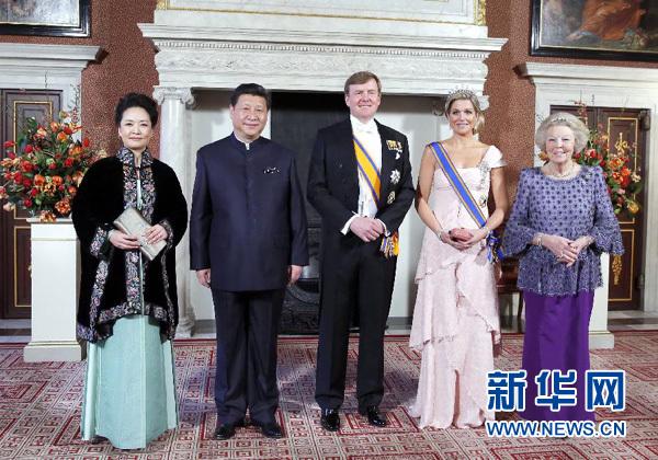 3月22日,國(guó)家主席習(xí)近平在阿姆斯特丹會(huì)見荷蘭國(guó)王威廉-亞歷山大。當(dāng)晚,威廉-亞歷山大國(guó)王在王宮為習(xí)近平舉行盛大國(guó)宴。威廉-亞歷山大國(guó)王、馬克西瑪王后、貝婭特麗克絲前女王共同迎接習(xí)近平和夫人彭麗媛到來(lái)。新華社記者鞠鵬攝