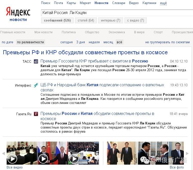 俄羅斯最大的搜索引擎Yandex.ru:當(dāng)在這里輸入“中國”、“俄羅斯”、“李克強(qiáng)”等詞條的時(shí)候,你能夠看到數(shù)以千計(jì)的消息,內(nèi)容涵蓋了李總理訪俄期間的所有活動(dòng)與話題。
