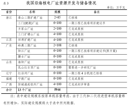 經(jīng)過多年努力,我國已儲(chǔ)備了一定規(guī)模的核電廠址資源。除已建和在建工程外,在沿海地區(qū)開展前期工作已較充分的廠址還有5000多萬千瓦,具體廠址資源開發(fā)與儲(chǔ)備情況見表3。
