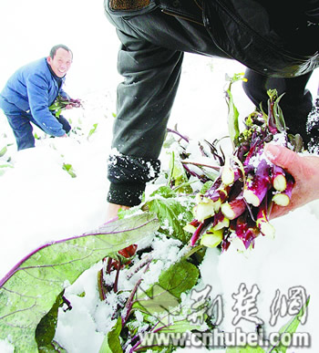 大雪給武漢市東西湖區(qū)蔬菜上市帶來不便。菜農(nóng)們每天下地在雪中搶摘蔬菜,既保證市場供應(yīng),又減少損失。