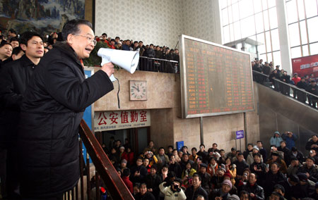 溫家寶還來到長沙火車站看望滯留車站的乘客。他動(dòng)情地說:“對大家滯留在這里,我向大家表示歉意,我們正在抓緊搶修,首先是搶修電網(wǎng),電網(wǎng)通了以后,火車就會通了,不需要很多的時(shí)間,大家就可以回家過年。春節(jié)快到了,我給大家拜個(gè)早年,謝謝大家!”