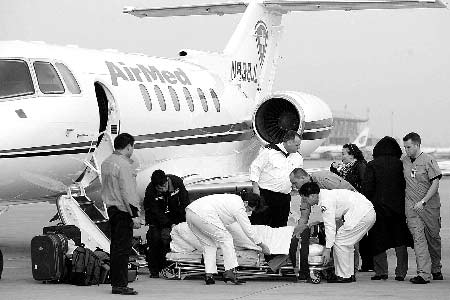在新鄭國際機場的停機坪內(nèi),記者看到一架紅白相間的小型噴氣式飛機,機身上紅色十字的救護標志十分醒目,飛機降落后,飛機內(nèi)的外籍機務(wù)人員和護士用專用的醫(yī)用擔架,將正在熟睡中的鄭麗抬下飛機,送上機場的120急救車,然后送往鄭州市內(nèi)一家醫(yī)院,整個過程用了半個小時。