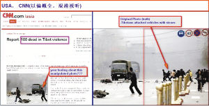 其一是“以偏概全,混淆視聽”。3月17日,CNN和法新社在各自網(wǎng)站上使用了同一張圖片,圖中兩輛綠色卡車一前一后正向兩名平民駛來——事實(shí)上,如果完整展示圖片的話,可以看到當(dāng)時(shí)軍車旁有約10名暴徒在向軍車投擲石塊,雖然CNN網(wǎng)站的圖片說明寫的是“藏人向軍車投擲石塊”,但圖中卻看不見這一已被裁去的場景。