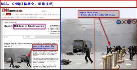 因此,“事件”初期,國(guó)際媒體上充耳塞目的是經(jīng)過“精心”剪裁的照片和聳人聽聞的關(guān)于拉薩的報(bào)道。令人不解的是,在事發(fā)三小時(shí)內(nèi),中新社首發(fā)了兩張拉薩古城濃煙滾滾、民眾倉(cāng)皇奔逃的即時(shí)照片,除了華人世界媒體廣泛采用外,可能只能躺在好多西方媒體圖片庫(kù)里呻吟了,要知道這是中國(guó)媒體最先發(fā)出關(guān)于拉薩事件中的第一聲“呻吟”啊,可能是人家剪裁起來不好下手吧!