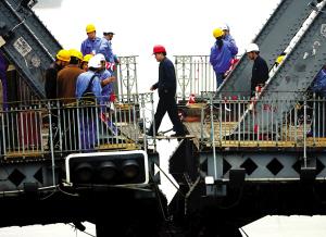 為保證外白渡橋移橋過程中橋梁結(jié)構(gòu)安全,移橋工作將分南、北兩跨分次進行。今天上午先移除南跨橋體,明后天移除北跨橋體。昨天下午,負(fù)責(zé)“移橋”的千噸駁船已進入金山路閘橋,停靠外白渡橋上游。今天上午9時10分,兩艘拖船將駁船拖至外白渡橋南跨橋體正下方,截至上午10時,駁船已開始頂升橋體。