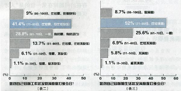 調(diào)查顯示,盡管大多數(shù)中青年干部的心理是健康的,但由工作、生活、人際等諸多壓力而造成的心理沖突、心理失衡和精神壓抑是無處不在、無時(shí)不有的。受訪者在回答“如果您覺得活得很累,您認(rèn)為您的壓力主要來自哪些方面?”這一問題時(shí),選擇最多的前三項(xiàng)分別是“工作責(zé)任心太強(qiáng),追求完美之累”,“工作負(fù)荷重,疲于奔命之累”,“迎合領(lǐng)導(dǎo)出政績(jī),失去自我之累”,選擇比例分別達(dá)到了51.3%,34.7%和29.2%,而選擇“交際太繁,苦于應(yīng)酬之累”,“前程靠人恩賜,職場(chǎng)非正常競(jìng)爭(zhēng)之累”的各占20.3%,并列排在第四位,最后依次是“家庭負(fù)擔(dān)重,子女入學(xué)就業(yè)之累”,占12.9%,“與同事、朋友比心理不平衡之累”,占5.9%,以及“多種壓力”等,占2.6%。